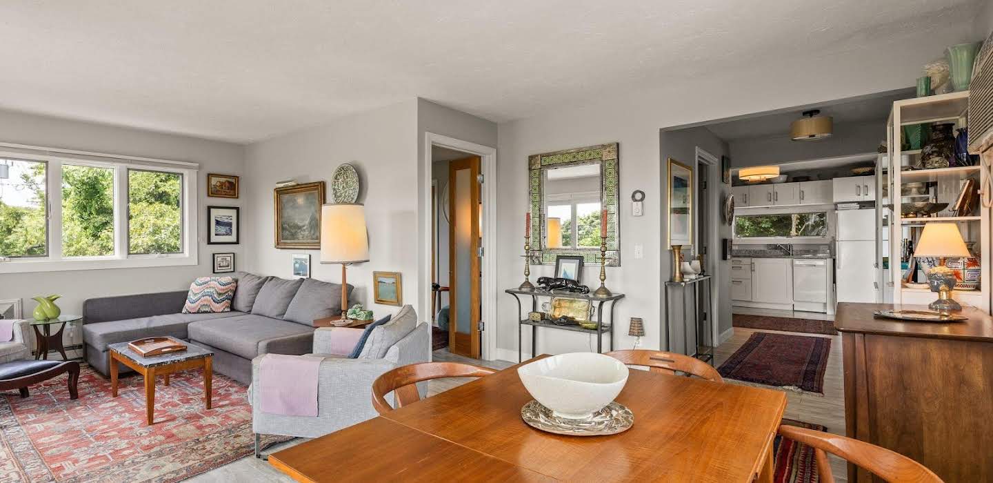 Enjoy waterviews from this cheerful sun-filled two-bedroom, two-bath condominium located in historic Mayflower Heights, directly across from access to a bay beach and adjacent to a bird sanctuary. There are windows on all four sides providing both morning sunrises and evening sunsets. This floor-thru condominium features an open plan with a spacious kitchen fully equipped with appliances, ample cabinetry, and generous amount of counter space. The living and dining areas boast two sets of patio doors that open to a porch with stunning bay views. Off the kitchen is a second larger deck of more than 100 square feet providing an ideal space for alfresco dining along with picturesque views. The unit includes two bedrooms. The primary bedroom is ensuite, while the second bedroom can serve as a multipurpose space or a cozy bedroom that accommodates a full-size bed. Additional features include ample parking, a large storage area, and a washer/dryer. Connected to the town sewer, this condominium is part of a well-managed five unit association. Rentals are welcome with a min.stay of three months. Come and enjoy the magic of Mayflower Heights, its beaches, walking trails and inspiring view