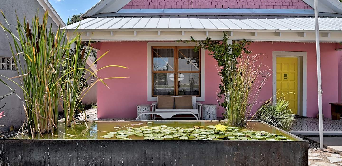 At the rear of the lot, just across the alley from the Hotel Paisano, is the 480 square-foot adobe studio. This low slung, vernacular structure was once a barn, and its rustic, plaster coated walls remain a prominent element in the updated design. With its raw wood ceilings, concrete floors, and elegantly-designed bathroom, the Studio is a stellar combination of old and new Marfa.