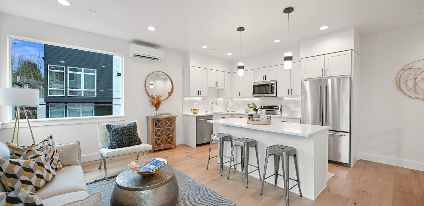 Beautifully crafted new construction homes by local award-winning green builder Modelremodel. 4 new townhomes located just minutes from the water. This contemporary residence boasts an open concept layout and timeless design. Custom cabinetry, stainless steel appliances, engineered hardwoods & designer lighting throughout. Large windows allow for abundant natural light. Spacious bedrooms w/ large built-in closets, ensuites and all the high-end touches. Mini-split heating/cooling + upper-level laundry with washer/dryer included! Spacious west facing rooftop deck showcases sound and mountain views - the perfect place to entertain. Off-street parking, pre-wired for EV charging. Built Green 4-star certified. This is one you won't want to miss!